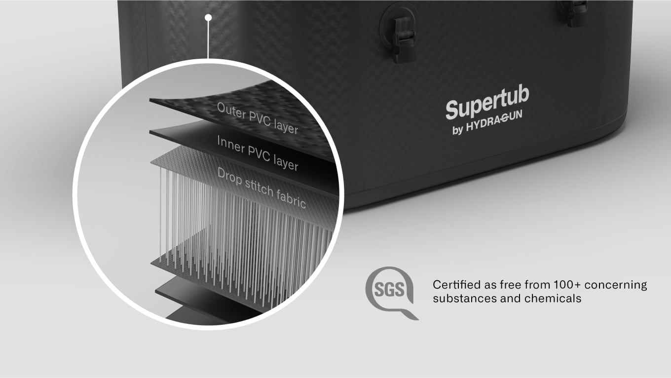 The main downside of an inflatable tub is of course that you’ll need to inflate it before use. This can be a hassle if you’re using a manual hand pump. So we include an electric air pump (worth $149) for free with every Supertub, so you can inflate it to the correct pressure of 10 PSI at the push of a button, and in just 4-5 minutes.